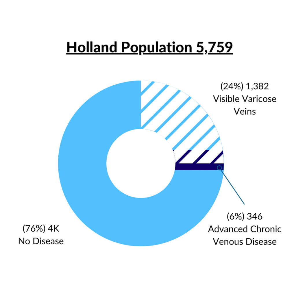 With Holland’s population estimated at around 3489 individuals, this translates to roughly 1,382 residents with visible varicose veins and 346 grappling with chronic venous disease.