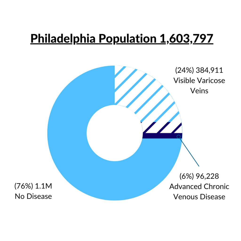 Considering Philadelphia’ population of approximately 3489, this means roughly 384,911 individuals have visible varicose veins, while 96,228 are dealing with chronic venous disease.